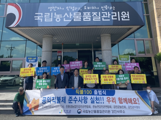 농관원 강진사무소에서 개최된 직불100 캠페인 출범식에는 강진군, 한국농어촌공사 강진지사, 강진군 농민회, 한농연강진군연합회, 강진군이장단연합회, 친환경농업인강진군협회 관계자가 참석했다.