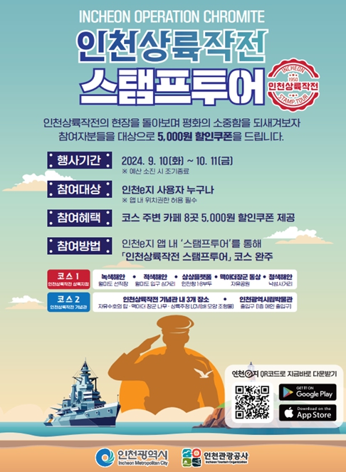 [남도저널 김용범 기자] 인천광역시와 인천관광공사는 9월 10일부터 10월 11일까지 인천상륙작전과 연계한 평화․안보 관광자원을 활용하여 ‘인천상륙작전 모바일 스탬프투어’를 운영한다고 밝혔다.