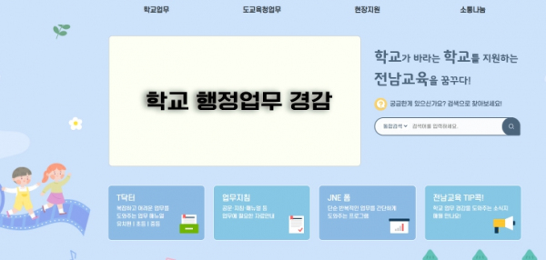 이번 개편된 업무DB는 ▲ T닥터 ▲ 업무지침 ▲ JNE폼 ▲ 전남교육 TIP콕! ▲ 현장 지원, 소통 나눔’으로 구성됐다.
