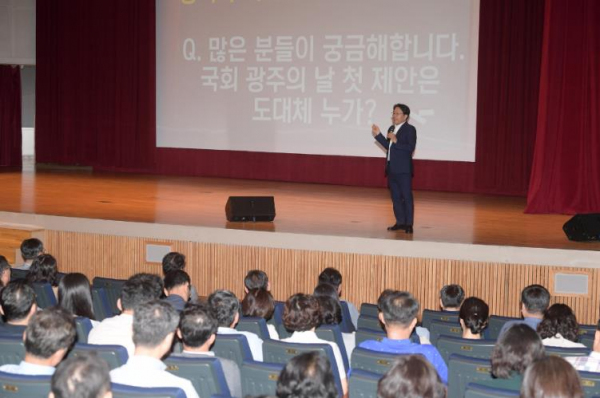 이날 정례조회는 ‘국회, 광주의 날’을 담당한 주무관의 발표로 시작됐다.