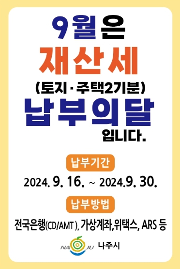 9월 정기분 재산세(토지, 주택2기분) 부과 및 납부에 관한 자세한 사항은 나주시 세무과에서 안내받을 수 있다.