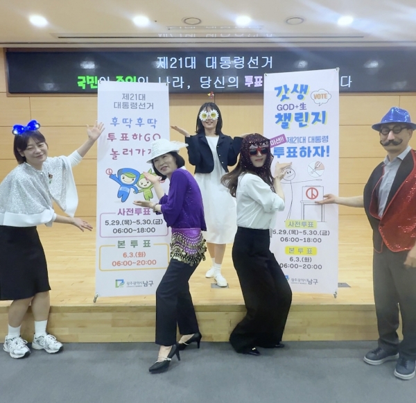 남구 관계자는 “우리 모두의 희망인 아름답고 행복한 나라를 만들기 위해 대통령 선거 투표 참여를 위한 다각적인 홍보를 진행 중이다”며 “우리가 바라는 세상은 나의 선택에서 시작되며 그 시작은 참정권 행사에 있다”고 밝혔다.