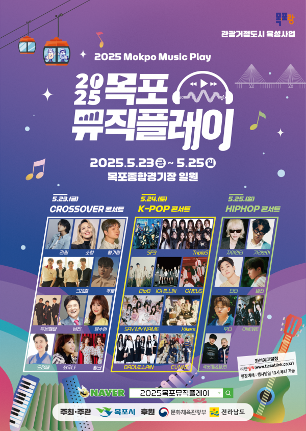 [남도저널] 정현동 기자=목포만의 음악 축제, ‘2025 목포 뮤직플레이’ 가 오는 5월 23일부터 25일까지 3일간 목포종합경기장 일원에서 화려하게 펼쳐진다.