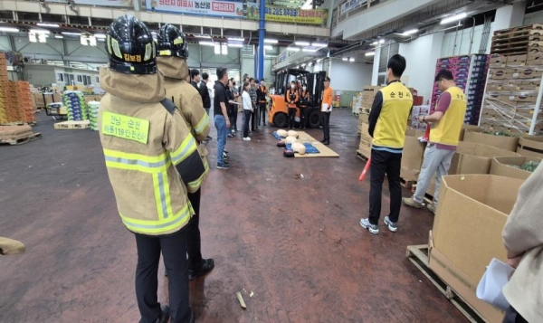 이번 훈련은 실제 화재 발생 상황을 가정해 초기 대응, 대피로 확보, 부상자 이송, 응급환자 발생 시 심폐소생술 등 전 과정을 체계적으로 진행한 실전형 훈련으로 도매시장 소속 법인 및 공판장 관계자와 순천소방서 유통종사자들이 참여했다.