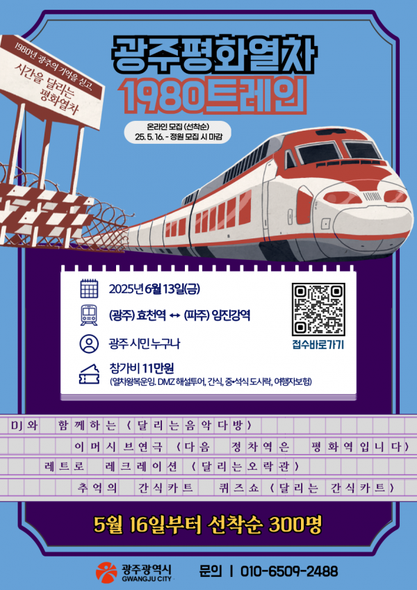 이 열차에는 총 370여명의 시민이 탑승할 예정이며 신청은 16일부터 광주광역시 누리집에서 선착순으로 접수한다.