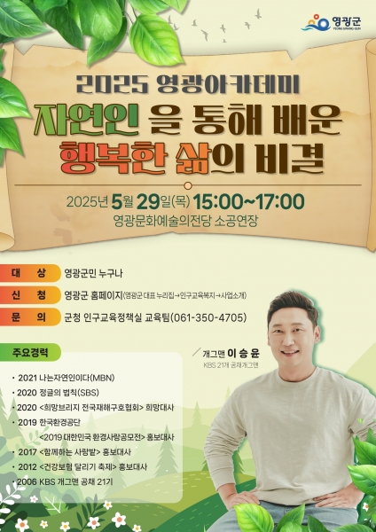 [남도저널] 김종훈 기자=영광군은 오는 29일 영광문화예술의전당 소공연장에서 군민들의 삶의 질 향상과 인문 소양 증진을 위해 2025 영광아카데미를 개최한다.
