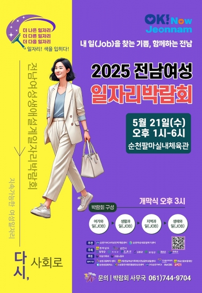 [남도저널] 김영도 기자 = 순천시는 오는 21일 오후 1시부터 6시까지, 순천팔마실내체육관에서 취업을 희망하는 여성들에게 일자리 정보를 제공하고 취창업을 연계하는 ‘2025년 전남여성생애일자리박람회’를 개최다고 밝혔다.