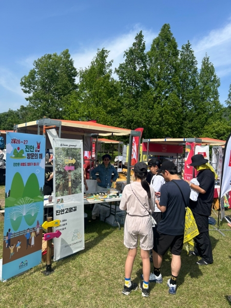 다양한 아웃도어 브랜드 체험 부스와 함께 진안군 대표 트레일인 ‘진안고원길’과 ‘2026~2027 진안방문의 해’홍보부스가 인기를 끌었으며 주민과 연계해 지역 농산물을 판매하는 부스도 큰 호응을 얻었다.
