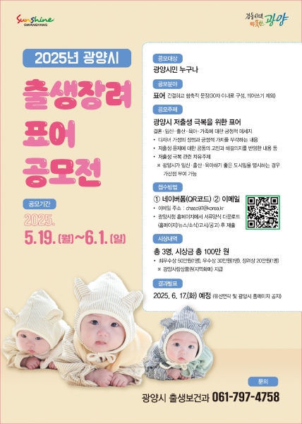 [남도저널] 김영도 기자 =광양시는 저출산 문제에 대한 시민들의 관심과 참여를 유도하고 결혼·출산·육아에 대한 긍정적 인식을 확산하기 위해 ‘2025 광양시 출생장려 표어 공모전’을 개최한다고 19일 밝혔다.