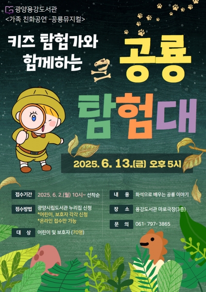 [남도저널] 김영도 기자 = 광양용강도서관이 오는 6월 13일 오후 5시, 마로극장에서 어린이와 가족 70여명을 대상으로 교육·참여형 뮤지컬 ‘공룡 탐험대’를 선보인다.