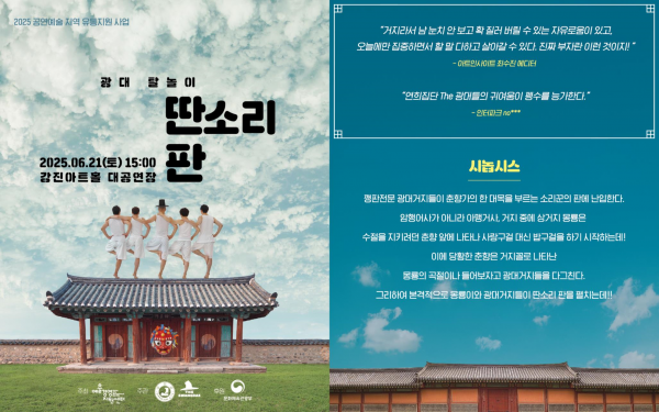 [남도저널] 양용숙 기자 =강진군이 오는 6월 21일 오후 3시 강진아트홀 대공연장에서 전통예술공연 ‘광대탈놀이 딴소리 판’을 선보인다.