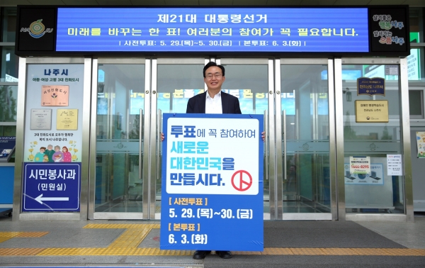 [남도저널] 김용범 기자 =전라남도 나주시가 6월 3일 제21대 대통령 선거를 앞두고 선거 행정 지원과 더불어 시민 유권자들의 소중한 한 표 행사를 독려하고 나섰다.