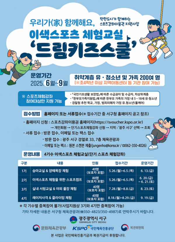 [남도저널] 김홍열 기자 = 광주광역시 서구가 복지 사각지대의 유·청소년을 위한 단기 스포츠 체험 강좌 ‘드림키즈스쿨’을 새롭게 선보인다.
