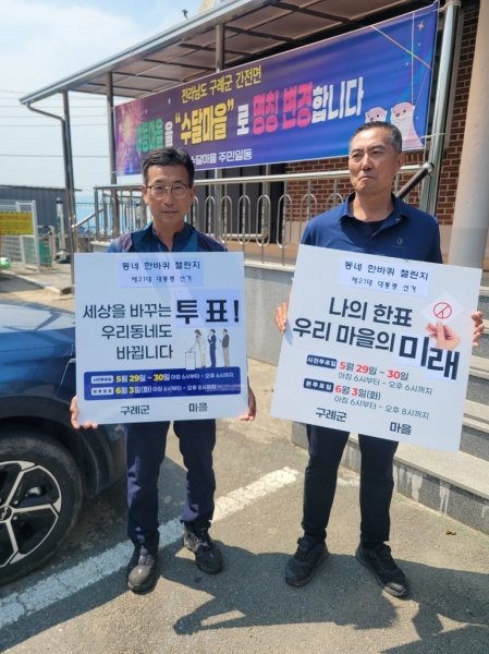 [남도저널] 김종민 기자 = 전남 구례군은 마을 이장들이 자발적으로 뜻을 모아 주민들의 선거 참여를 독려하는 ‘동네 한바퀴 챌린지’ 캠페인이 개최됐다고 밝혔다.