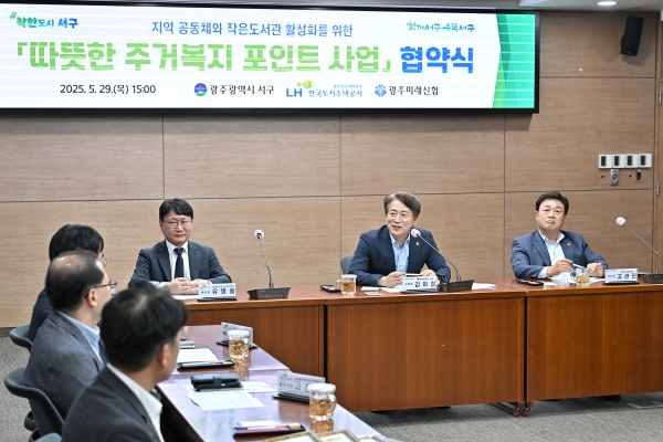 서구는 29일 서구청 나눔홀에서 김이강 서구청장, 유병용 LH광주전남지역본부장, 고관진 광주미래신협 이사장 등 관계자 8명이 참석한 가운데 ‘따뜻한 주거복지 포인트 사업’ 협약을 체결하고 작은도서관 활성화를 위해 협력하기로 했다.