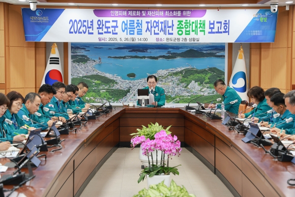 [남도저널] 봉현구 기자 = 완도군은 지난 26일 군청 상황실에서 여름철 집중호우, 태풍, 폭염 등 자연 재난에 대비하기 위한 보고회를 개최했다.