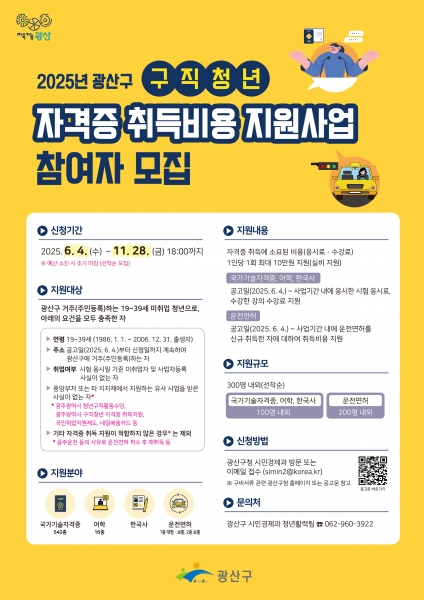 [남도저널] 김용범 기자 = 광주 광산구가 미취업 청년들의 자기 계발과 취업 역량을 강화할 수 있도록 ‘구직청년 자격증 취득비용 지원사업’을 추진한다.