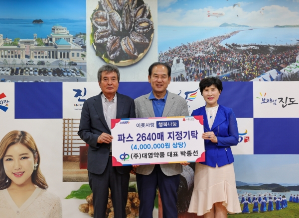 [남도저널] 봉현구 기자 =진도군은 최근 ㈜대영약품으로부터 파스 2,640매를 기탁받았다고 밝혔다.