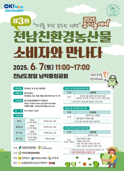 김영석 전남도 친환경농업과장은 “유기농데이는 지속가능한 농업과 전남 친환경농산물의 가치를 널리 알리는 뜻깊은 행사”며 “생산자와 소비자가 함께하는 이번 행사에 도민의 많은 관심과 참여 바란다”고 말했다.