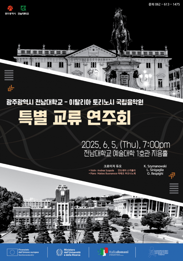 이 공연은 전남대학교와 토리노 주세페 베르디 국립음악원의 특별교류 연주회로 마련됐다.