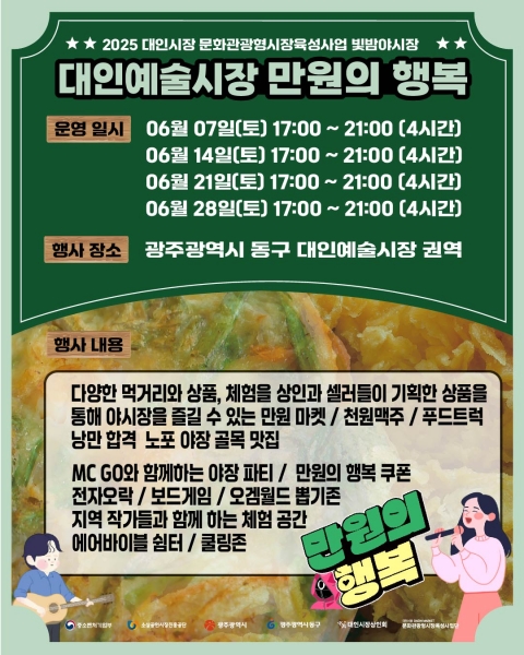대인시장에서 진행되는 이번 행사는 상인들이 직접 야시장 운영 콘셉트와 콘텐츠 기획에 참여해 마련한 행사로 예술인 공연, 셀러 체험, 주민 참여 이벤트가 어우러진 복합형 장터로 운영된다.