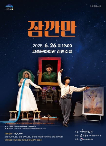 군 관계자는 “연극 ‘잠깐만’은 명화를 주제로 한 창작극으로 마임 특유의 몸짓과 상상력을 통해 평범했던 그림과 일상을 새로운 예술적 시각으로 바라보게 될 것”이라며 “앞으로도 다양한 장르의 공연을 통해 군민의 문화 향유 및 접근성 향상에 힘쓰겠다”고 말했다.