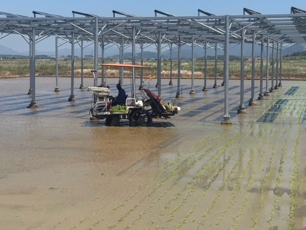 군은 산이면 간척 내 벼 재배지 3,000㎡ 부지에 1,000㎡ 면적의 영농형태양광 시설을 설치하고 지난주 모내기 작업을 마쳤다.