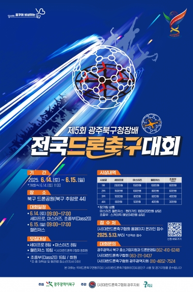 [남도저널] 김홍열 기자 =광주시 북구가 오는 14일부터 15일까지 2일간 북구드론공원에서 ‘제5회 광주 북구청장배 전국 드론축구대회’를 개최한다고 11일 밝혔다.