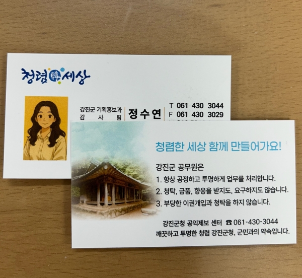 뒷면에는 △강진군 공익제보센터 전화번호 △청탁금지·투명한 업무 처리 등 청렴 실천 다짐 문구를 담아, 명함을 받은 민원인이 공직자의 청렴 의지를 체감하고 부조리나 비위 행위에 대해 보다 쉽게 신고 창구에 접근할 수 있도록 구성됐다.