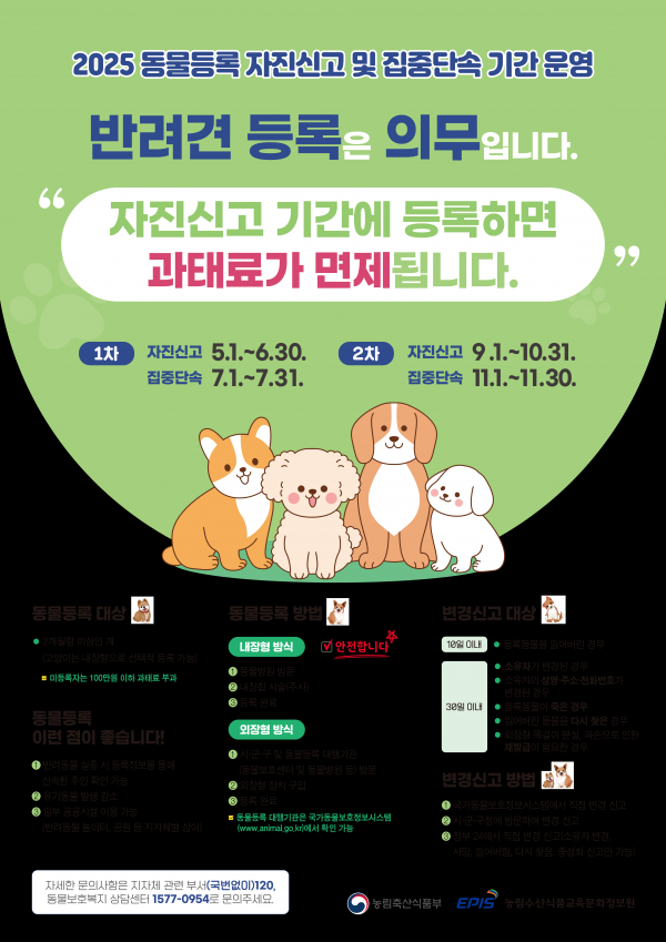동물등록제도 활성화를 위한 ‘자진신고 및 집중단속 기간’은 올해 2차례 운영된다.