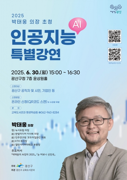 박병규 광산구청장은 “박태웅 의장님과 함께하는 이번 강연은 현실로 다가온 디지털 전환, 인공지능 시대를 이해하고 기술이 아닌 인간, 사회, 우리의 삶의 관점에서 더 나은 변화를 이야기하는 소통의 자리가 될 것”이라며 “인공지능과 살아가는 현재를 성찰하고 살아갈 미래를 내다보는 뜻깊은 강연에 많은 시민이 함께해 주시길 바란다”고 전했다.