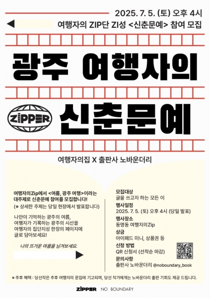 [남도저널] 김홍열 기자 =광주 동구는 오는 5일 오후 4시 광주 대표 관광 플랫폼 ‘여행자의 ZIP’에서 감성 글쓰기 프로그램 ‘여행자의 ZIP단ZI성–여름, 광주 여행’ 신춘문예를 개최한다고 밝혔다.