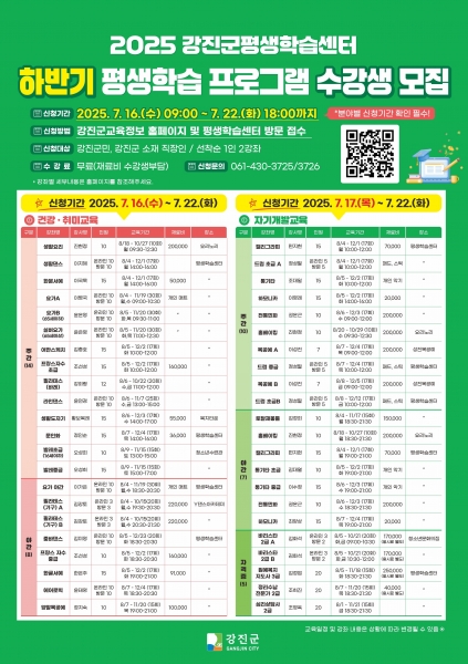 [남도저널] 양용숙 기자 =강진군 평생학습센터가 오는 16일부터 2025년 하반기 평생학습 수강생을 선착순 모집한다.