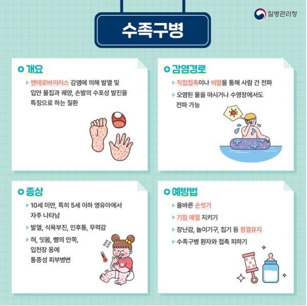 수족구병은 장바이러스로 인해 발생하는 급성 바이러스성 질환으로 환자의 대변 또는 분비물과 직접 접촉 시 전파된다.