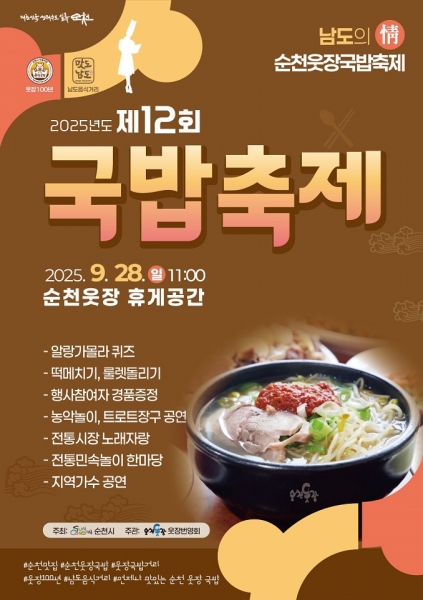 [남도저널] 순천시는 오는 28일 100년 역사의 전통시장이자 국밥의 성지로 불리는 순천 웃장에서 ‘제12회 순천 웃장 국밥축제’를 개최한다고 밝혔다.