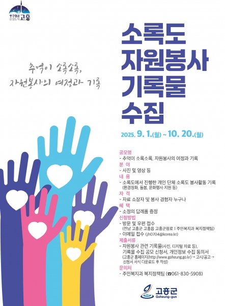 [남도저널] 김태현 기자 =고흥군은 오는 10월 20일까지 전국의 개인·단체 자원봉사자가 소장하고 있는 소록도 자원봉사 기록물 수집 공모를 추진한다고 밝혔다.