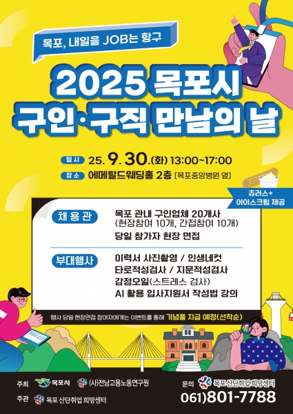 이번 행사는 목포시가 주최하고 전남고용노동연구원이 주관하며 지역 구인기업 20개사가 참여해 기업 설명회와 현장 면접을 진행한다.