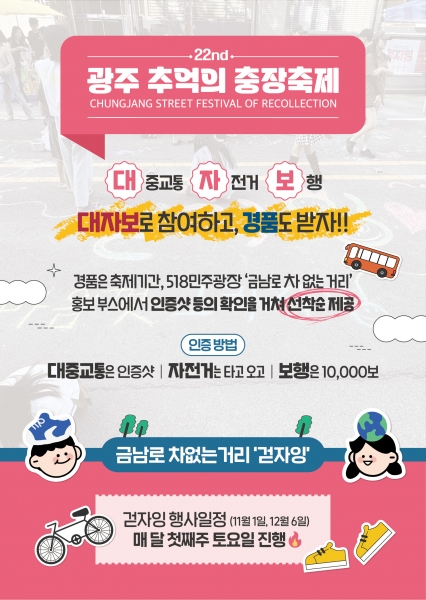 [남도저널] 김용범 기자 =광주 동구는 오는 15일부터 5일간 금남로와 충장로 일원에서 열리는 제22회 광주 추억의 충장축제에서 ‘금남로 차 없는 거리’의 가치를 알리고 대자보 도시 정책에 시민 참여를 확대하기 위한 특별 홍보 이벤트를 진행한다고 밝혔다.