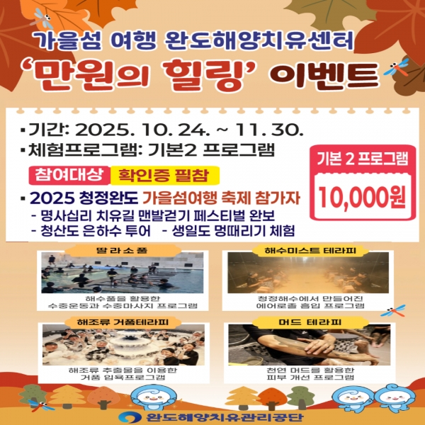 [남도저널] 양용숙 기자 =완도해양치유센터에서 10월 24일부터 26일까지 개최되는 ‘2025 청정 완도 가을 섬 여행’과 연계해 ‘만원의 힐링’ 이벤트를 진행한다.