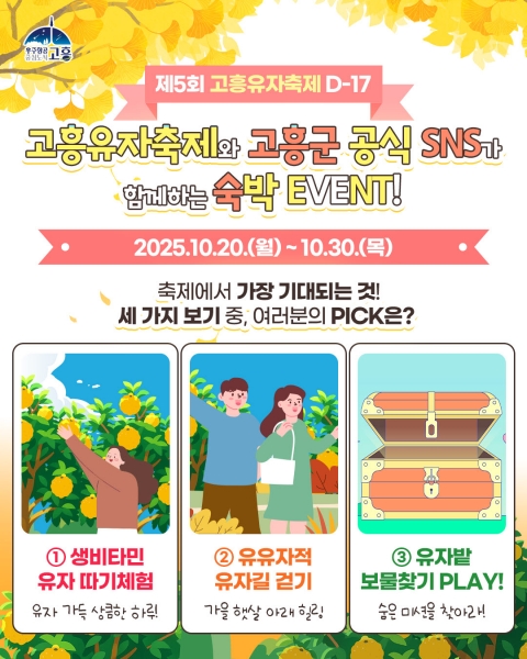 [남도저널] 김태현 기자 =고흥군은 10월 20일부터 30일까지 11일간, 고흥군 공식 SNS 채널을 통해 ‘제5회 고흥유자축제 D-17 숙박이벤트’를 진행한다고 밝혔다.
