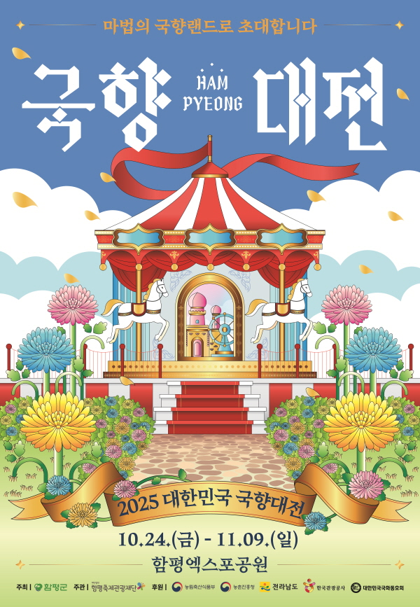 한편 2025 대한민국 국향대전은 오는 10월 24일부터 11월 9일까지 17일간 함평엑스포공원 일원에서 ‘마법의 국향랜드’를 주제로 회전목마와 대관람차, 마법의 성 등 대형 국화조형물과 명품 국화분재 작품 전시, 브라스밴드 거리공연, 마법의 휴먼포토 등 다양하고 생동감 있는 전시·공연·체험프로그램으로 관람객을 맞이할 예정이다.
