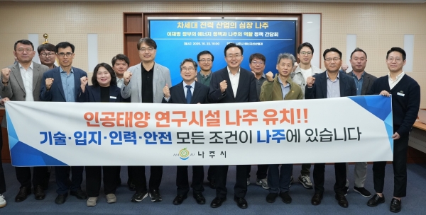 또한 간담회 참석자들은 ‘인공태양 연구시설 나주 유치’를 염원하는 퍼포먼스를 진행하며 정부 공모사업 대응 의지를 함께 다졌다.