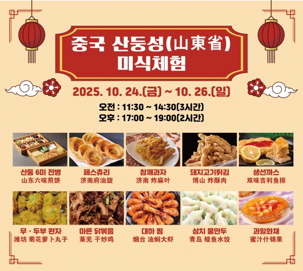 이에 따라 26일까지 3일간 산둥 6미 전병을 비롯해 무와 두부로 만드는 완자, 삼치 물만두 등 10여 개의 산둥성 각 지역의 특색요리를 맛볼 수 있다.