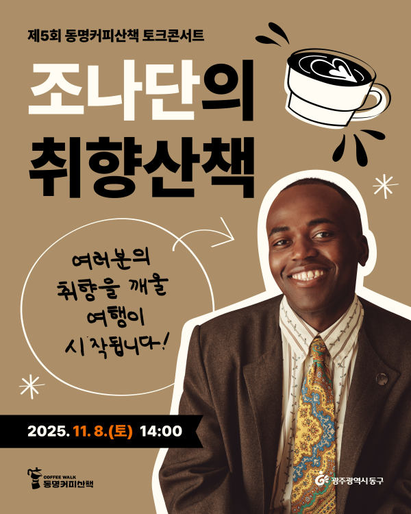[남도저널] 김용범 기자 =광주 동구는 오는 11월 8일 동명동 카페거리 일원에서 열리는 ‘제5회 동명커피산책’에 방송인 조나단이 참여하는 토크콘서트 ‘조나단의 취향 산책’을 개최한다고 밝혔다.