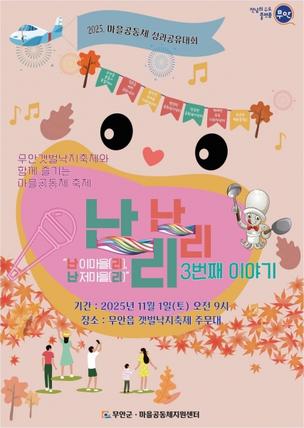 [남도저널] 정현동 기자 =전남 무안군(군수 김산)은 11월 1일 무안읍 갯벌낙지축제 주무대에서 ‘난리난리 제3탄’을 2025년 무안군 일반농산어촌개발사업 성과발표회로 개최한다.