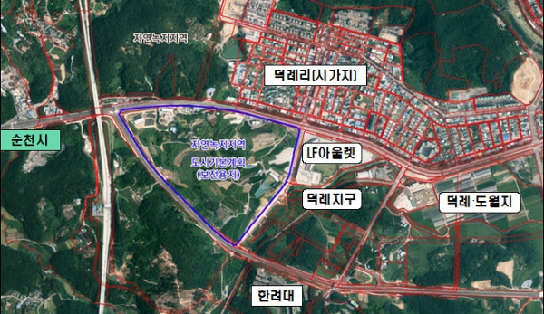 덕례지구는 인근 도시인 순천시와 경계부로 덕용로와 국도 2호선을 남북으로 접하고 있으며 주변은 기 개발지인 LF스퀘어, 덕진@, 흥안에르가@, 대림@ 등과 신규 개발을 추진 중인 덕례지구단위계획구역, 덕례~도월 도시개발지구와 연계한 도시개발 여건이 양호한 지역이다.