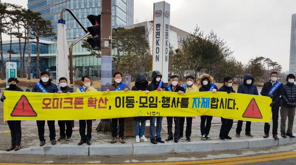[남도저널] 나주시가 최근 코로나19 오미크론 변이 바이러스 확진자 급증에 따른 시민들의 경각심 고취를 위해 유관기관과의 합동 방역 캠페인을 실시했다.