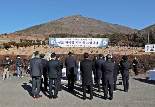 이날 행사는 합동성묘의 취지에 맞게 방역수칙을 지킨 가운데 군수, 군의회 의장, 의원, 부군수를 비롯한 간부공무원, 공무원노조위원장 등 15명의 최소인원이 참석했다.