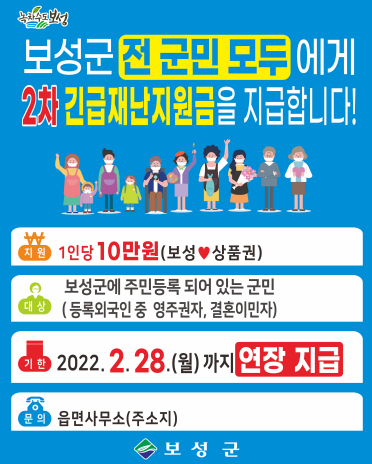 [남도저널 김용범 기자] 보성군이 전 군민을 대상으로 지급하는 2차 긴급재난지원금 지급 일정을 2월 28일까지 1개월 연장한다고 밝혔다.