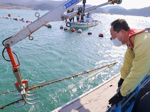 명현관 군수는 8일 다시마 엽체 녹음 및 탈락 피해해역을 방문하여 끝녹음 현상이 발생한 다시마를 직접 확인하고 실의에 빠진 피해어가를 위로했다.
